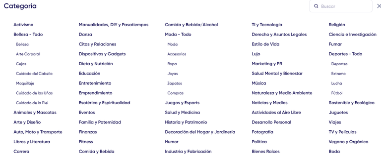 Es óptimo especificar 2 o 3 categorías que reflejen con mayor precisión la temática requerida. Debe evitar categorías excesivamente amplias o contradictorias, ya que esto reduce la precisión de la búsqueda. Se recomienda experimentar con la combinación de nichos: por ejemplo, la combinación de las categorías "Deportes" + "Finanzas" puede llevar a cuentas en el nicho de apuestas o análisis deportivo.