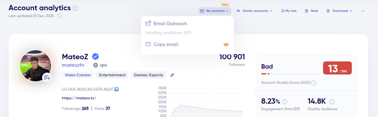 • "Envoyer un email" — pour certains comptes, un courriel électronique peut être indiqué, utilisable pour contacter directement l’influenceur.