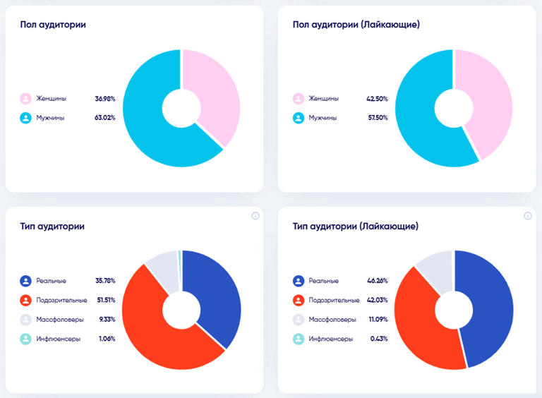 • «Тип аудитории (качественная аудитория)» — помогает определить, какая часть подписчиков является реальной, а какая — накрученной.